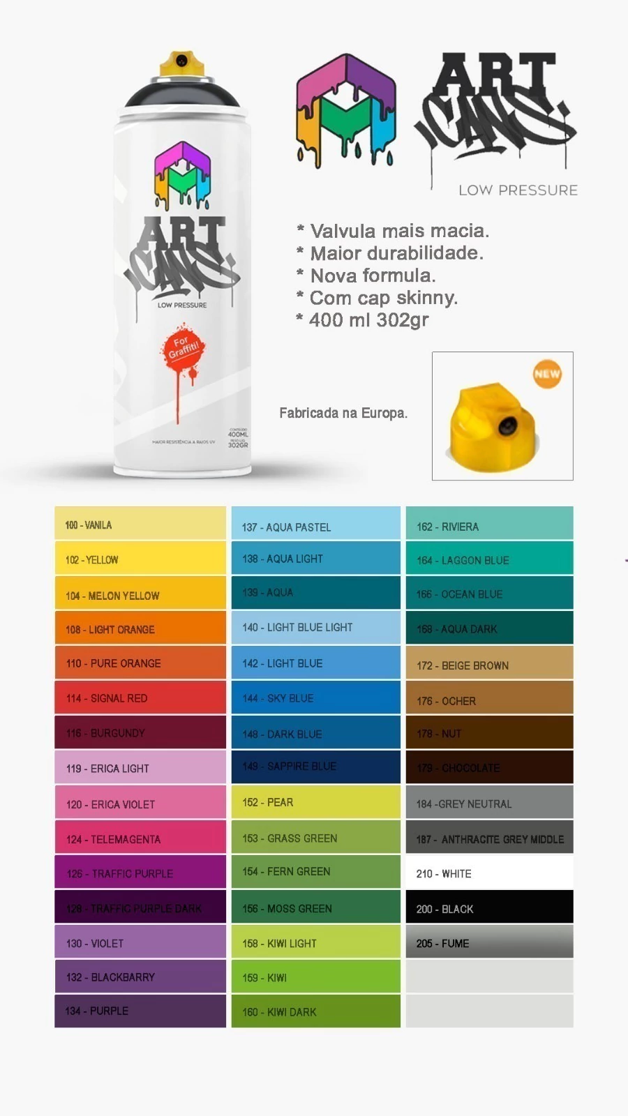 Tinta Spray ART CANS 400ml 302gr, fabricado na Europa, baixa pressão. Excelente durabilidade, possuindo mais aditivos para tenha maior resistencia e durabilidade em areas externas