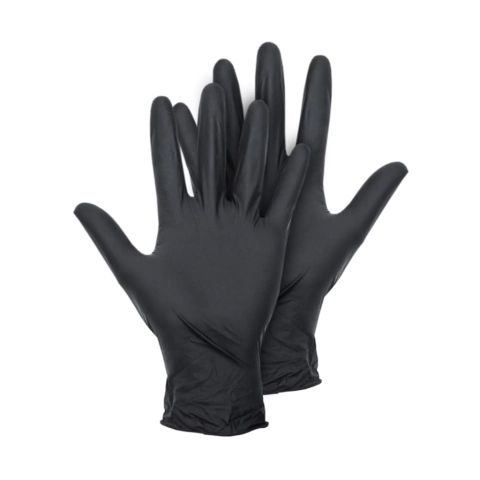 Luva preta descartavel, sem latex, com superficie lisa e sem pó.